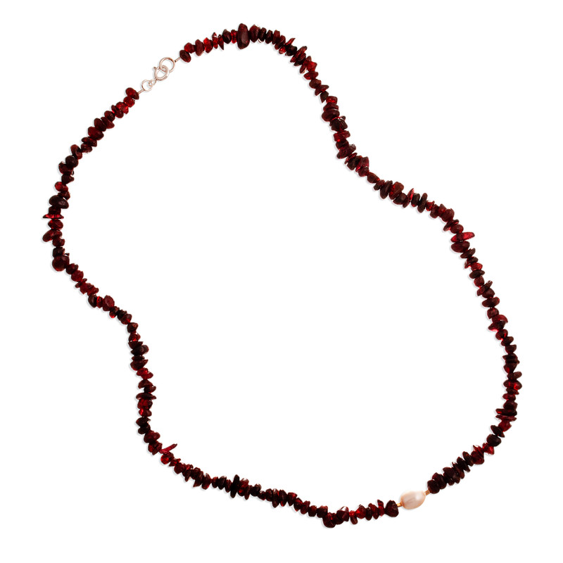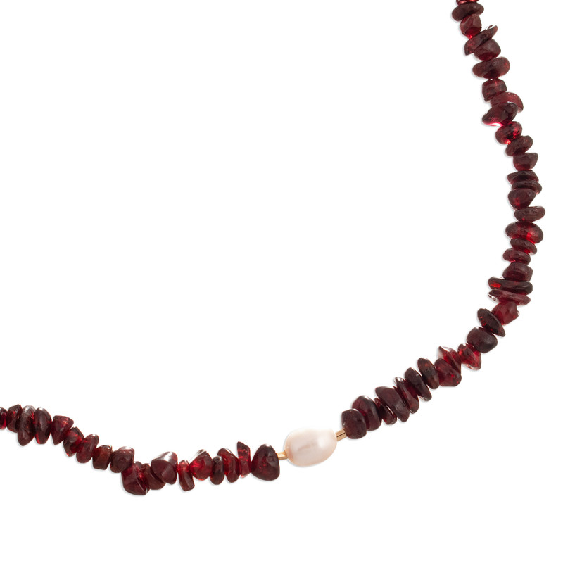 Backed by our 100% Happiness GuaranteeThe ocean blesses you with passionate energies, present in the garnet jewels that adorn this necklace by Silvia Garcia of Peru. The artisan enriches the gems' crimson hue with a cultured pearl—in a natural silver-white shade—and 24k gold-plated accents, whereas a sterling silver clasp completes the design with convenience.