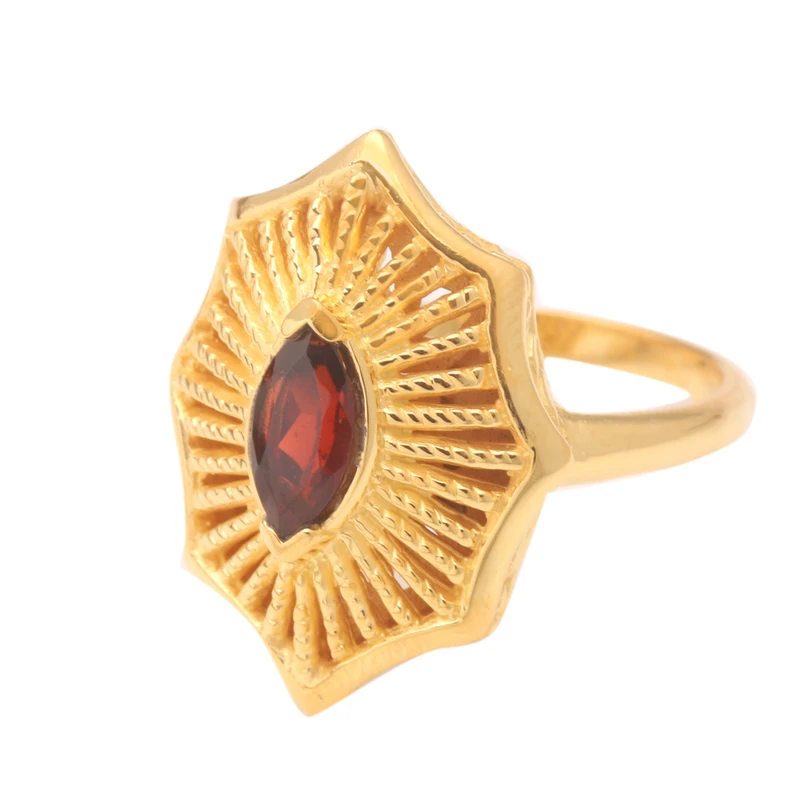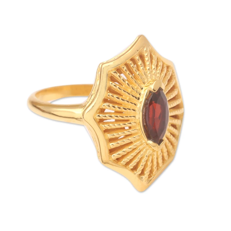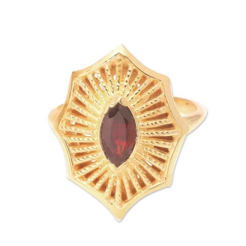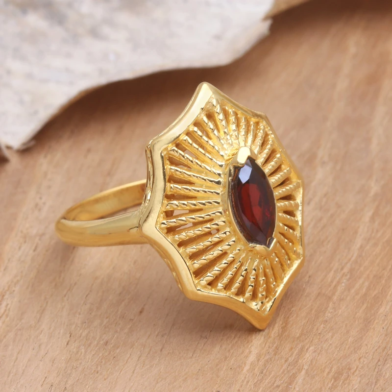 Suggestive of a spider's web, this lovely cocktail ring is the original creation of Giri Tasmana in Bali. The 18k gold-plated sterling silver ring is set with a crimson marquise-cut garnet at the center. The ring sparkles with a high-polish finish.