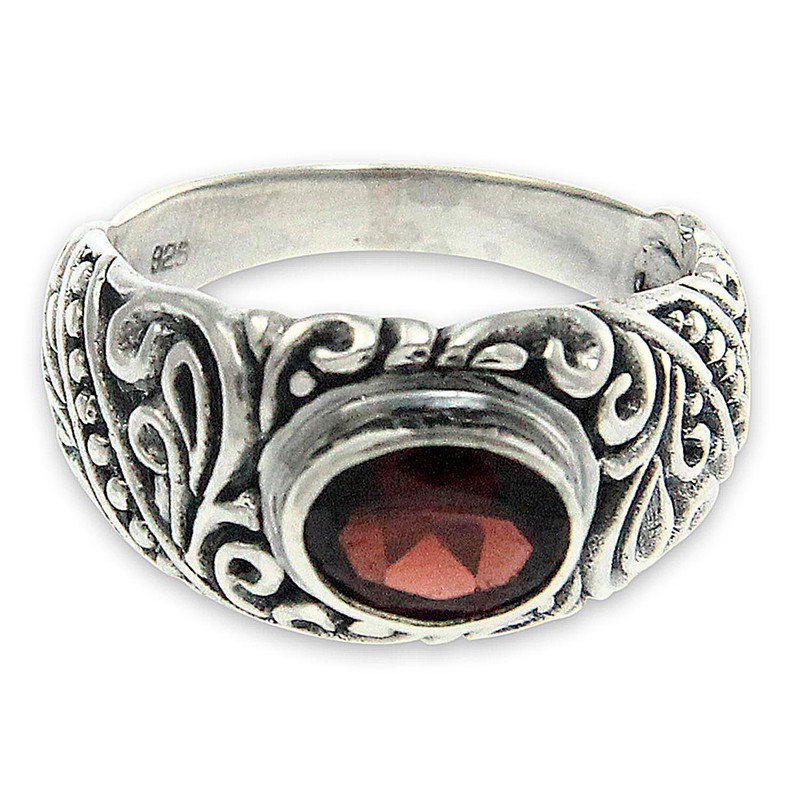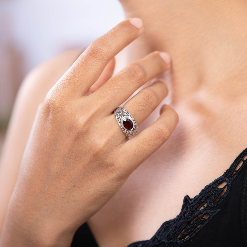 Kenari recreates the florid patterns of Javanese batik for the splendid design of this ring. Crowned with a glowing red garnet, the sterling silver ring features oxidized contrasts that bring out floral details.