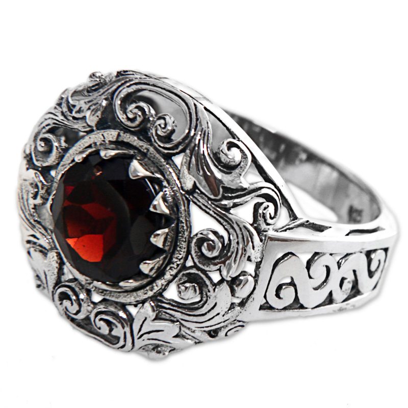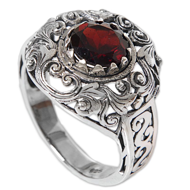 Backed by our 100% Happiness GuaranteeDesigned and crafted by Indonesian artisan Agung Jagra, this ring features a 2.5 carat garnet. Sterling silver leaf and swirl designs outline the faceted stone and twist down the side of the ring's band.