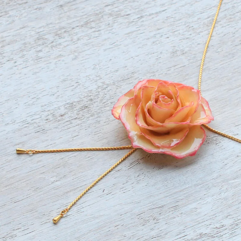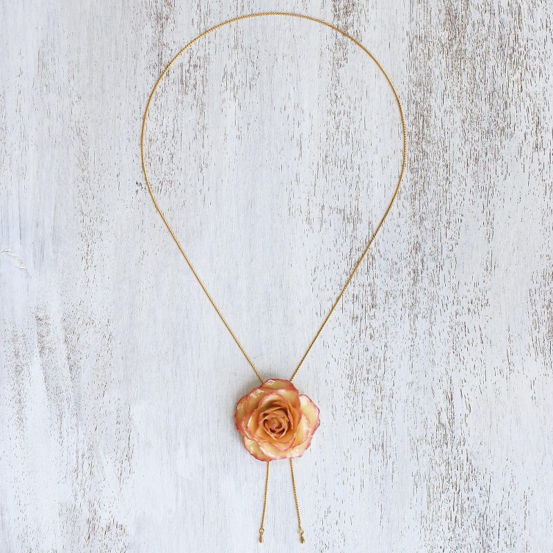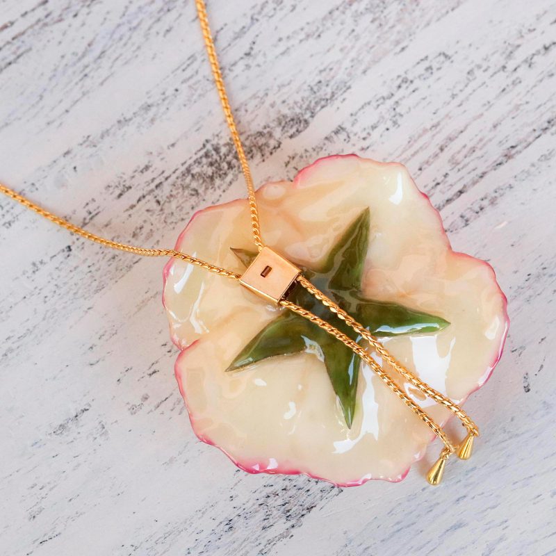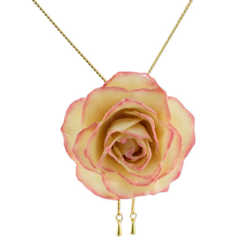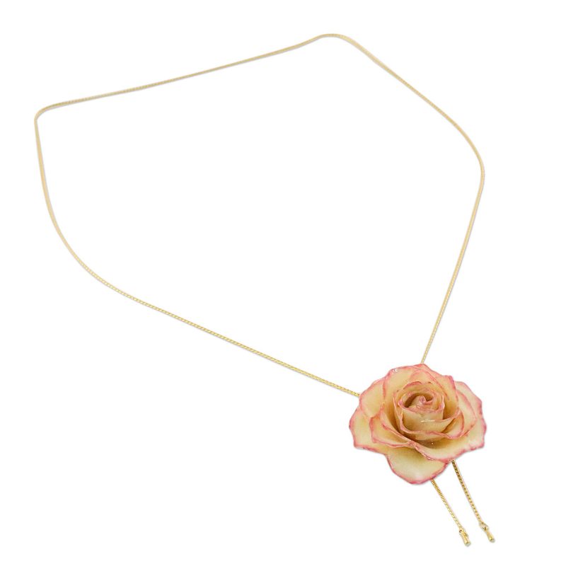 Thai artisans preserve the timeless beauty of a garden rose, presented by Danai in this unforgettable bolo-style necklace. They carefully select a miniature rose with an antique ivory color tipped with pink, fortifying it with a painstaking technique where the natural petals are bathed with a clear, glossy resin. The pendant of this necklace moves along a gold-flashed brass chain.