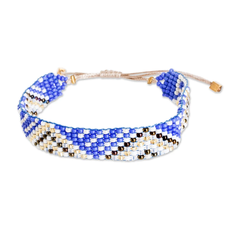 Delivery EstimateGuatemalan artisans from the Hands Of Atitlan Association see in the region's stunning landscapes the perfect muse for a series of unique accessories. Made from glass beads, this wristband bracelet displays a geometric pattern inspired by Atitlan's mountains, featuring a palette of blue and golden hues for a radiant look.