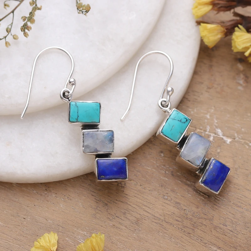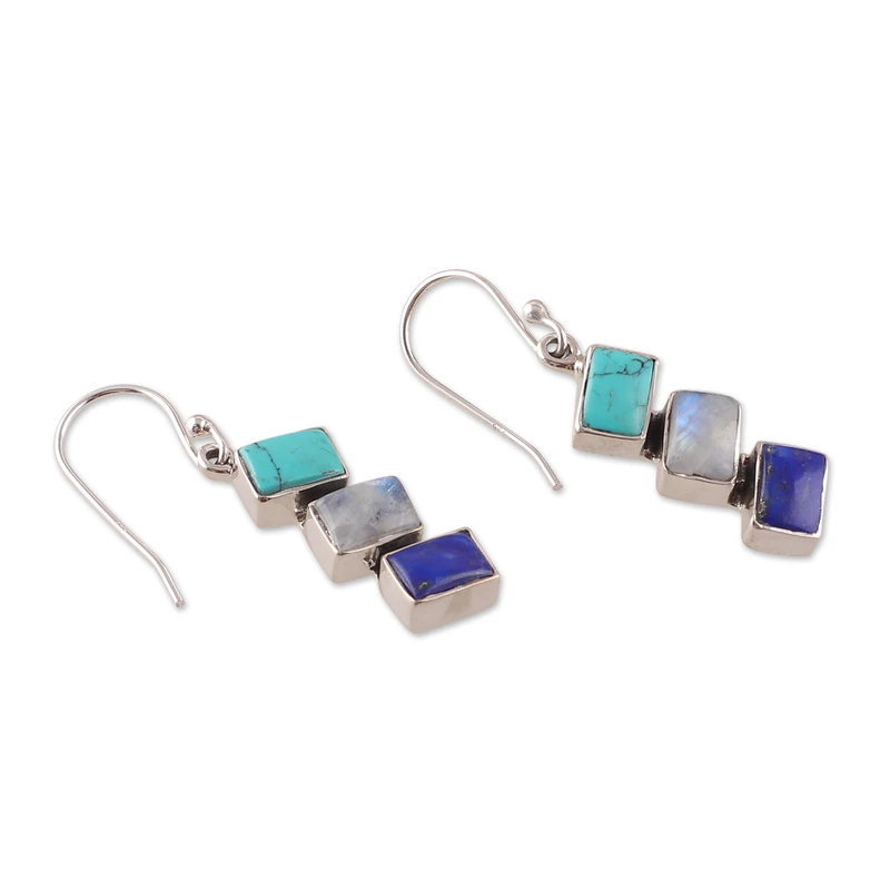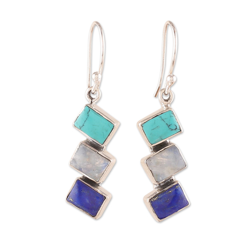 Climb these ladders to reach a fantastic oceanic world, presented by Neeru Goel. Crafted by Indian artisans with masterful expertise in jewelry arts, these sterling silver dangle earrings showcase a wondrous geometric design that embraces calcite, rainbow moonstone and lapis lazuli jewels, whose rectangular shapes shine with a palette of sea-themed hues.