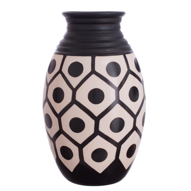Backed by our 100% Happiness GuaranteeAdd a cultural and modern touch to your home decor with this decorative vase from Peru. Jesús Rivas, working in the tradition of Chulucanas ceramics, handcrafts the vase to feature a wide body, decorated with hexagon and dot motifs in black and ivory tones that evoke modern designs. The black color is achieved by firing the vase with mango tree leaves. On the bottom, the vase is marked with the artist's name, the name of his hometown, and the phrase Hecho a mano (made by hand).