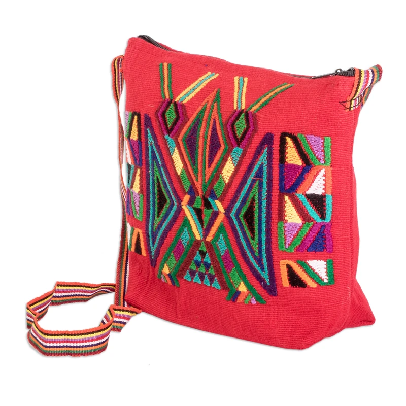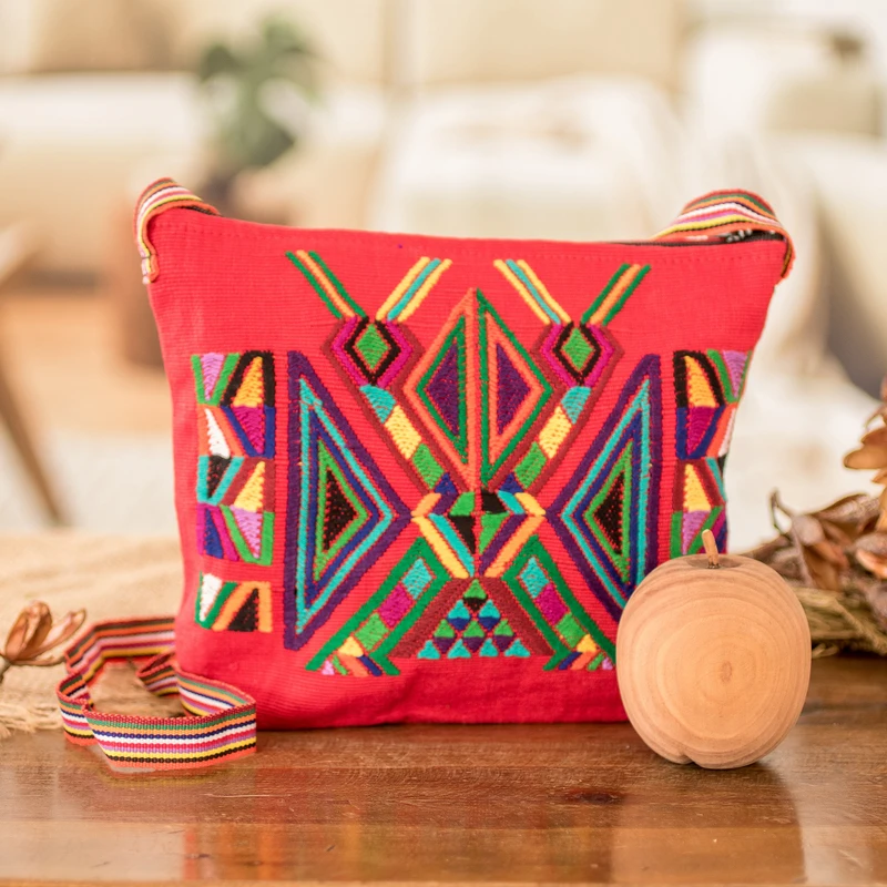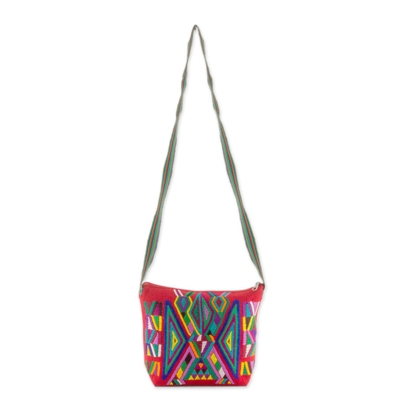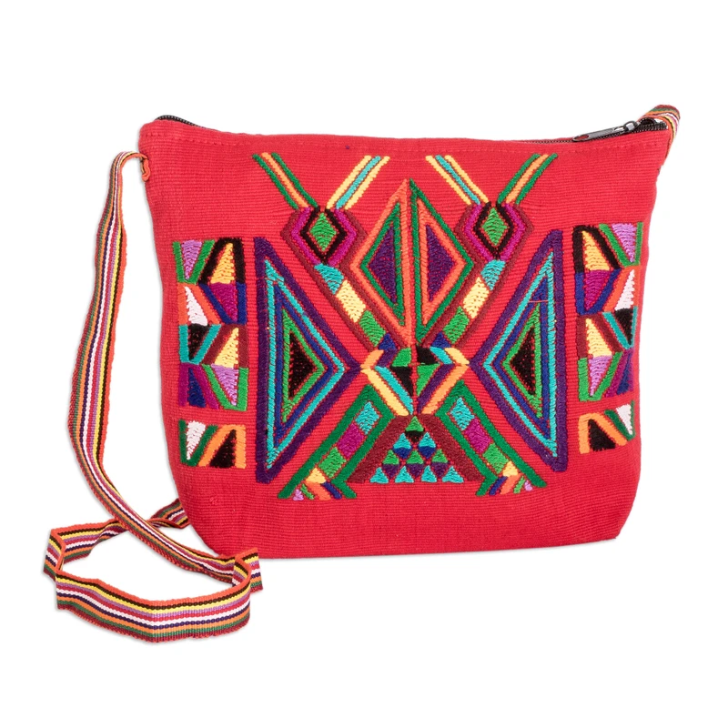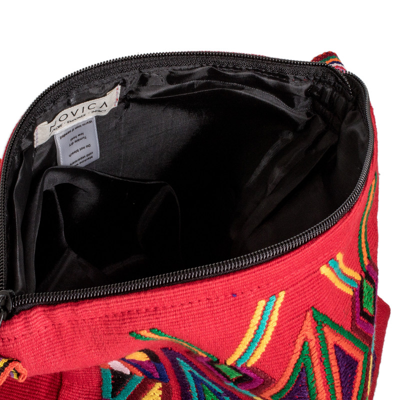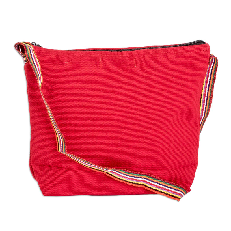 Delivery EstimateRepresenting an effort to provide a bigger platform for local artisans, Guatemala's Women United for Artisan Development presents this characteristic sling handbag. The women artisans hand-weave the bag of cotton on the traditional telar de cintura and telar de pie looms, adding multicolored geometric designs over its poppy-red body. The bag drapes over the shoulder on a single strap, and opens with a zipper to a lined interior in red.