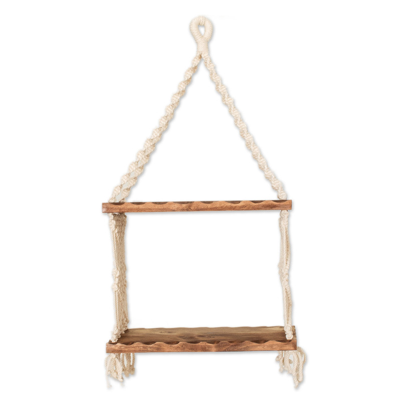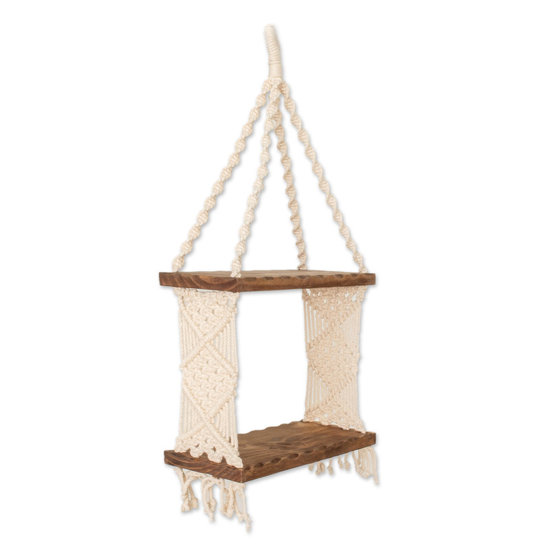 Backed by our 100% Happiness GuaranteeA blend of rustic wood and intricate macrame, this geometric-themed hanging shelf brings warmth and charm to your decor. Two pinewood tiers rest securely within hand-knotted cotton cords, with delicate fringes swaying below for a natural, carefree finish. Whether for plants, books or your favorite treasures, this design by Joelle Perret in Costa Rica makes any space a little more inviting.