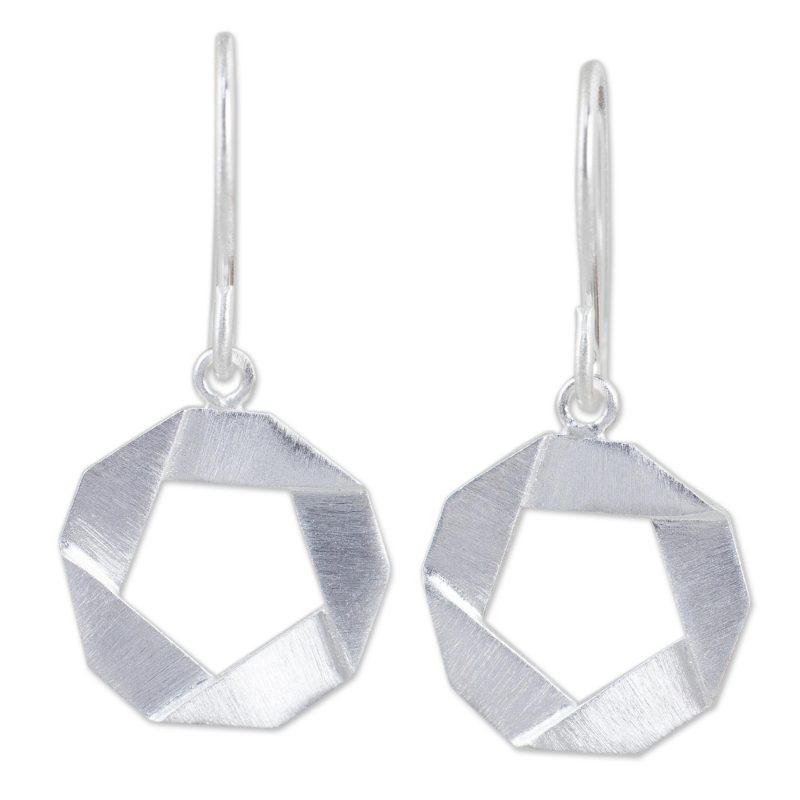 Ribbons of brushed sterling silver form precise pentagons in these contemporary earrings from Jantana in Thailand. She gives the dangle earrings her trademark brushed satin finish.