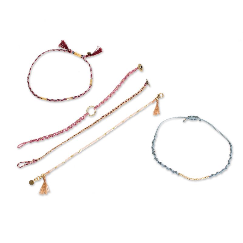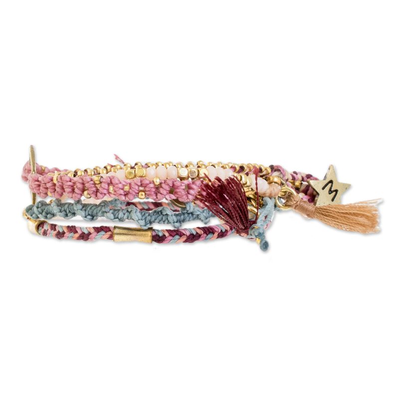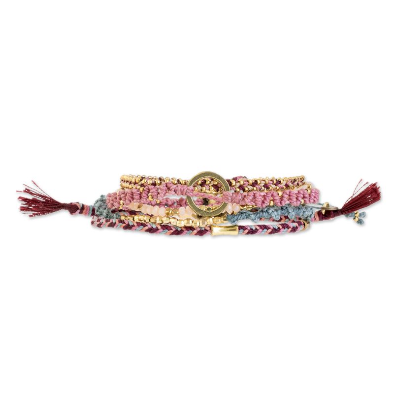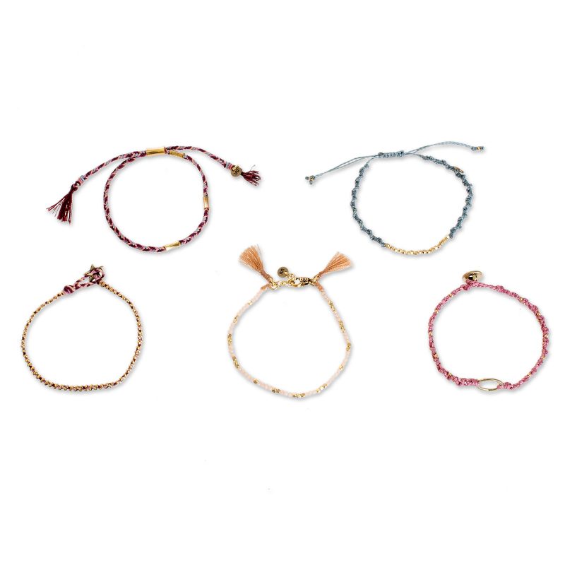 Delivery EstimatePromoting rural Guatemalan handicrafts, Wakami presents this set of bracelets for sharing with friends. Local artisans create these five bracelets, which are knotted by hand from polyester cord in various colors. Each bracelet features a different design and arrangement of beads; one is centered with a round metal pendant. Three bracelets are non-adjustable, while two adjust with a sliding knot. Each bracelet is accented with a charm with Wakami's trademark.