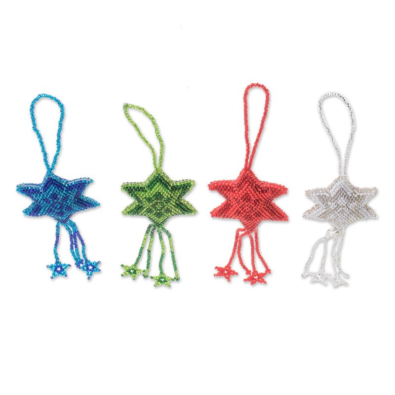 Delivery EstimateIn colors of blue, green, red, and white, four stars are handcrafted from petite glass beads in this set of four ornaments from Guatemala. Say the artisans, "Christmas is a marvelous time that allows us to share with our families, spend happy moments, remember, and give thanks for familial union."