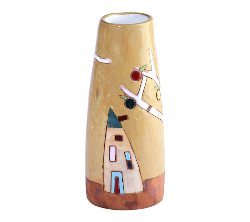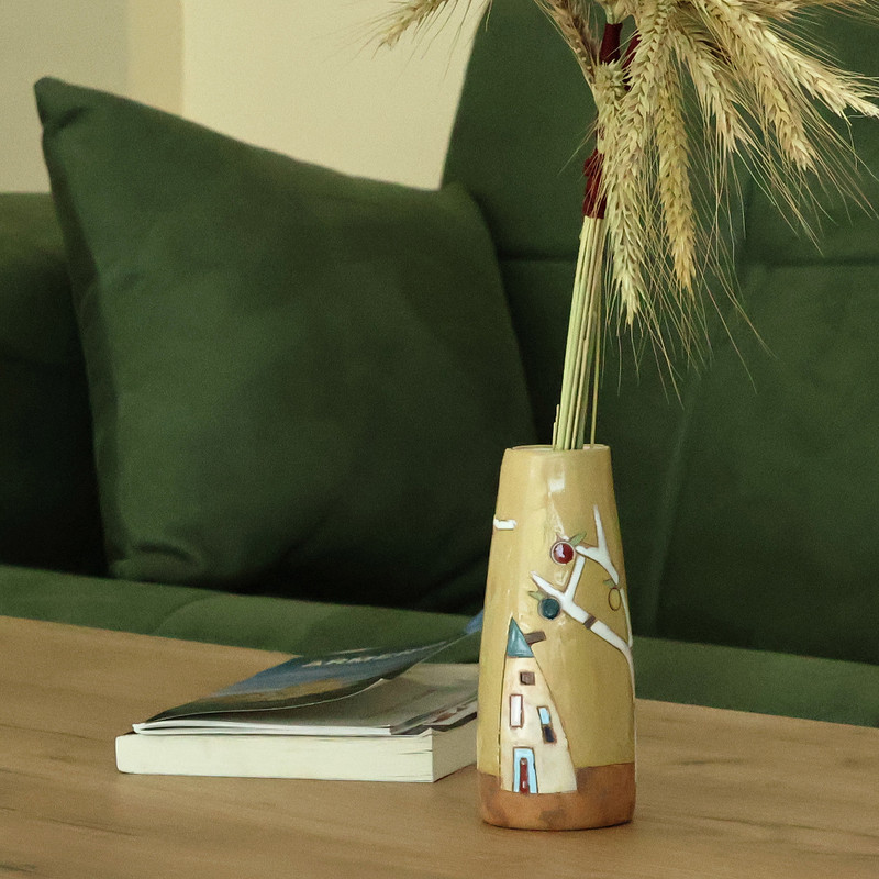 Embark on a journey through Armenia's rich heritage with the pomegranate, the nation's revered fruit symbolizing prosperity and good fortune. Drawing inspiration from this cultural emblem, artisan Arsen Badalyan crafts a resplendent glazed ceramic vase adorned in a captivating honey hue. This gorgeous accessory portrays a bucolic landscape featuring a majestic pomegranate tree and two lovely countryside cottages. Elevate your space with this vibrant vase that celebrates nature's bounty and provides a charming canvas to showcase your beloved floral treasures.