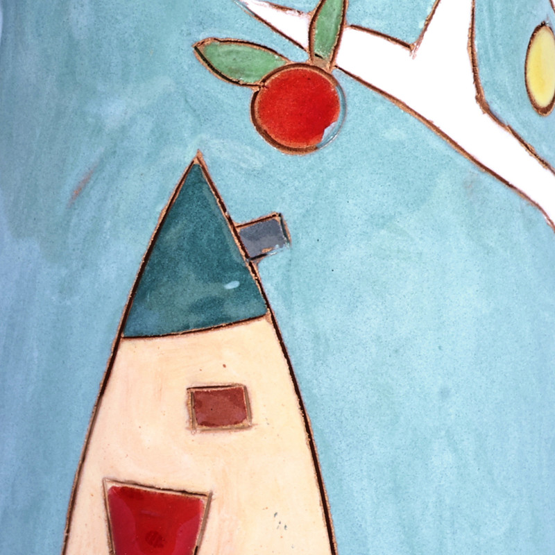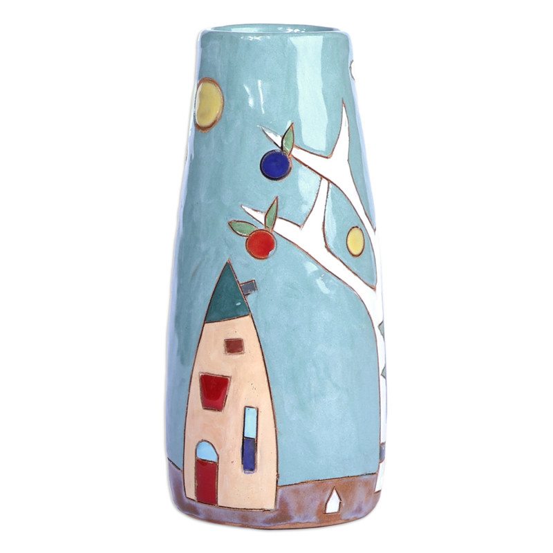 Display your flowers in spectacular style with this sublime glazed ceramic vase handcrafted by Armenian artisan Arsen Badalyan. Drawing inspiration from the pomegranate, his homeland's national fruit and symbol of fertility and good fortune, Badalyan hand-paints a vibrant scene of a flourishing pomegranate tree and two charming cottages bathed in warm sunlight, transporting you to the tranquil countryside.