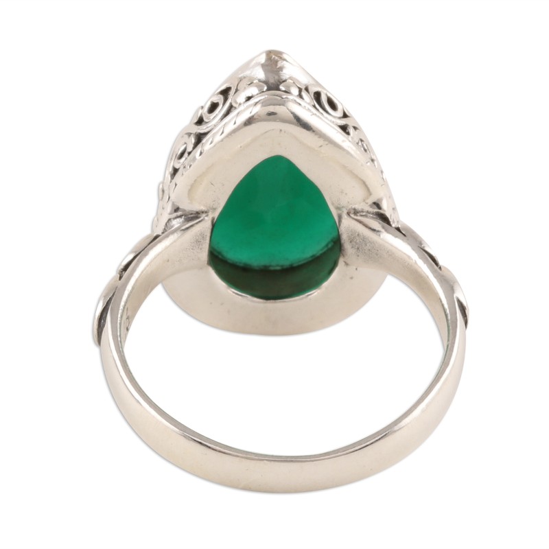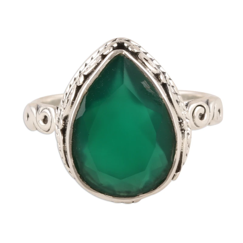 Backed by our 100% Happiness GuaranteeGlittering with verdant hues, a five-carat onyx teardrop centers this cocktail ring from India. Shivany Choudhary designs the ring, which graces the finger with intricate swirl patterns in sterling silver.