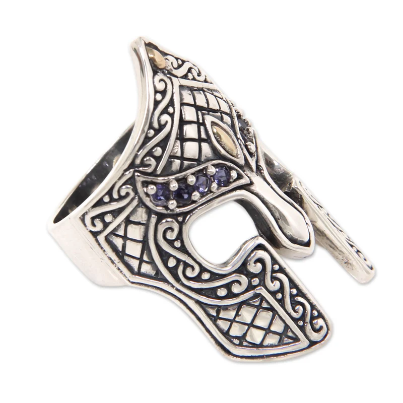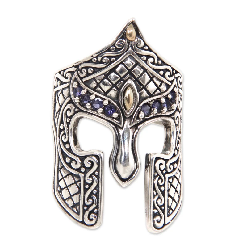 Backed by our 100% Happiness GuaranteeBy Putu Gede Darmawan, this handsome men's ring takes its inspiration from an ancient Etruscan armored mask. Rich silver textures add depth and beauty, while applications of 18k gold add a regal feel. Ten blue iolite gems define the brow.