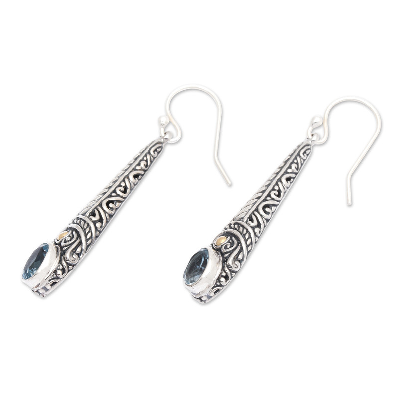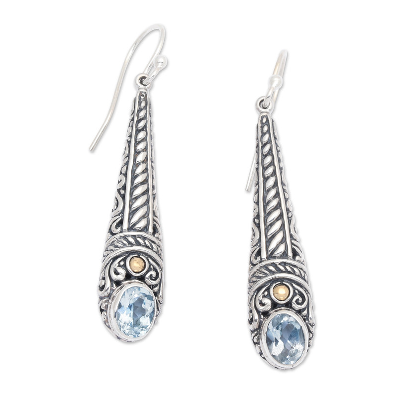 Backed by our 100% Happiness GuaranteeWorking with a passion for Balinese jewelry, Kadek Wijanegara presents a beautiful and mysterious pair of dangle earrings. Local artisans handcraft two cone shapes of sterling silver with 18k gold accents, elaborated with intricate rope and swirl patterns that caress one carat of blue topaz gemstones.