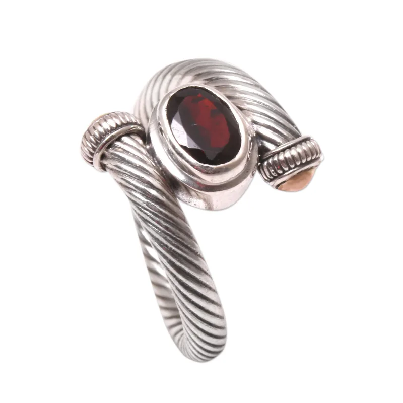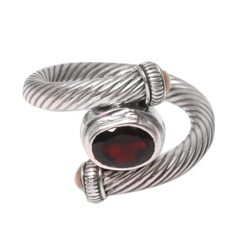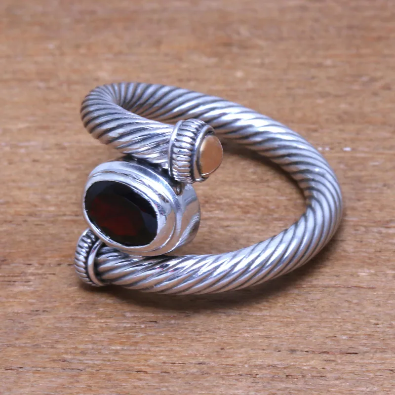 Cradled by rope patterns in sterling silver, a faceted oval of natural garnet displays natural hues in the center of this band ring from Bali. Dewa Arimbawa designs this charming accessory, accentuated by 18k gold.