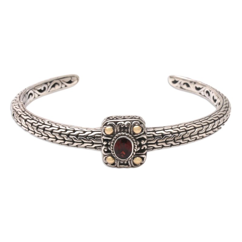 Backed by our 100% Happiness GuaranteeSilver, gold, and a glowing red gem mingle in this lavish cuff bracelet from Dewi Putera. The Balinese artisan hand crafts the cuff from sterling silver, centering her design with a faceted garnet gem that sparkles in a bezel setting. 18k gold-plated sterling silver details accent the gem with a beautiful shimmer.