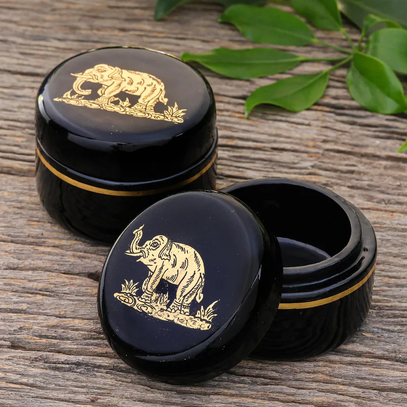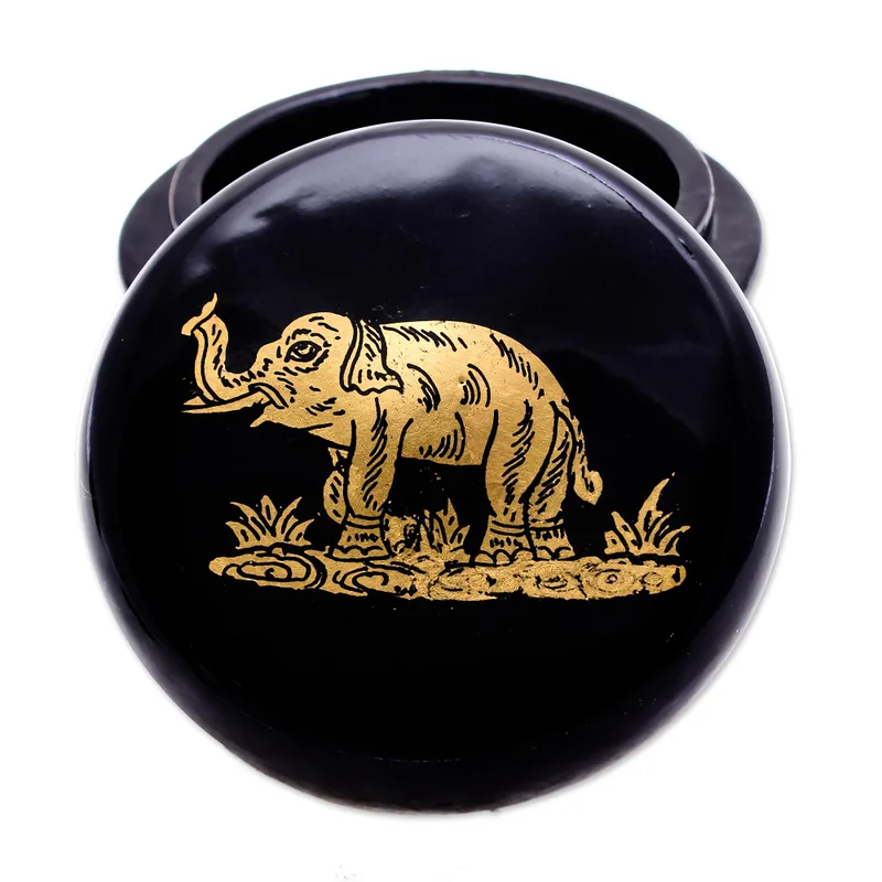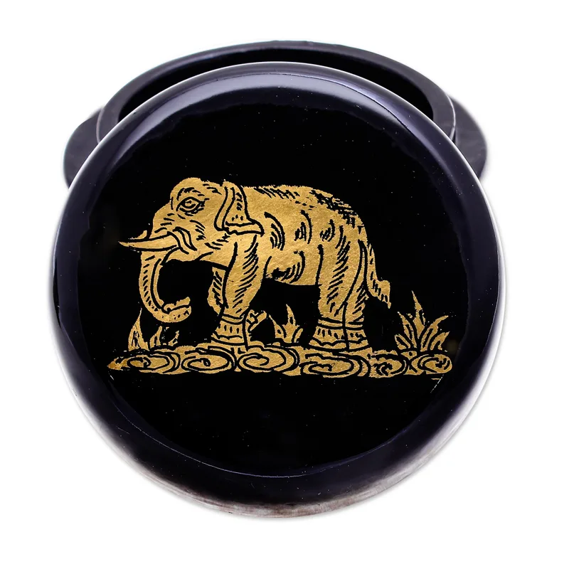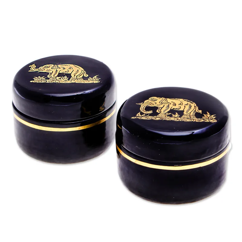 Covered in gold foil and glossy black lacquer, Subin Tositarat's pair of decorative boxes add a touch of luxury to your home decor. Thai artisans hand carve the pair from mango wood, coating each box in lacquer before creating an elephant motif from 24k gold foil.