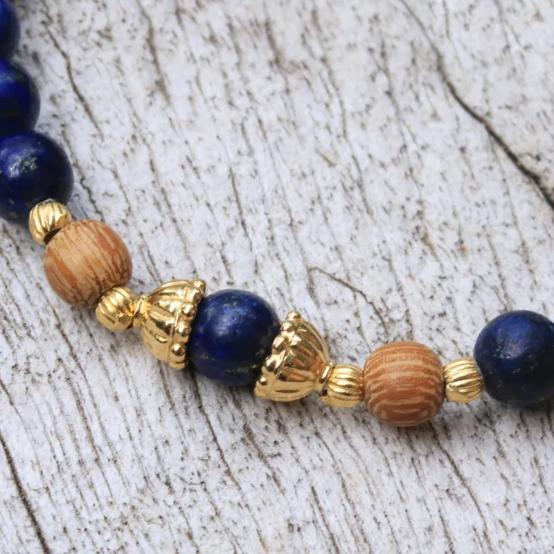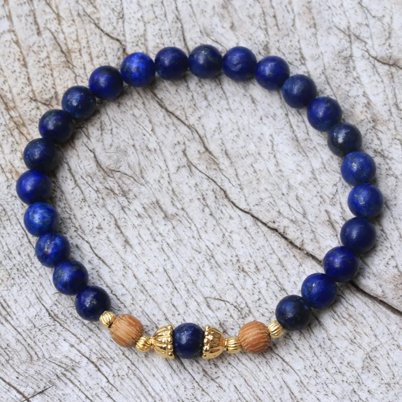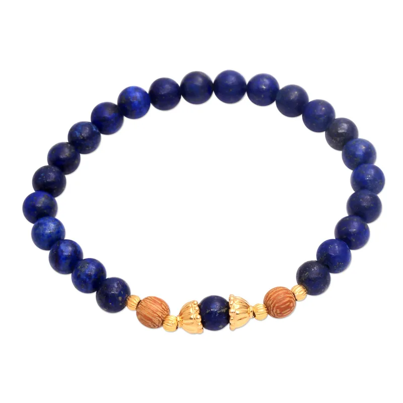 Choosing gemstones of deep blue lapis lazuli, Balinese artisan Ketut Sulastri strings this beaded stretch bracelet with a musical harmony. The bracelet is accentuated with petite beads of 22k gold plated sterling silver and natural cumala wood. Ketut names the bracelet after Batuan, a Balinese village noted for its handicrafts.