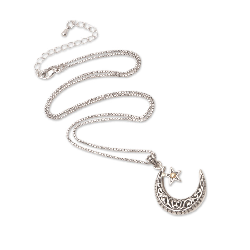 Backed by our 100% Happiness GuaranteeAccented with bright gold, the star on Made Suyana's pendant necklace twinkles next to its crescent moon companion. Balinese artisans use sterling silver to hand craft the pendant, centering the star with an 18k gold-plated sterling silver drop.