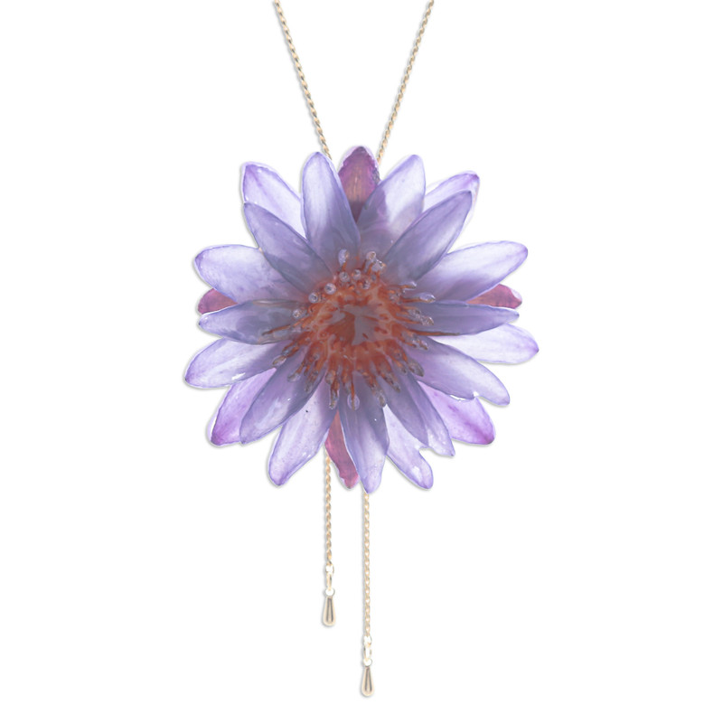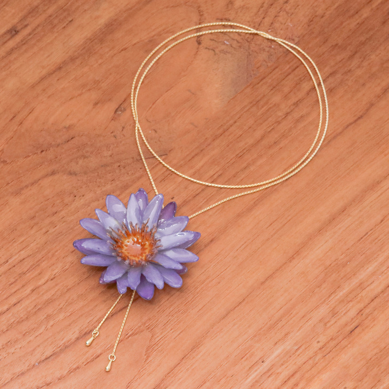 Backed by our 100% Happiness GuaranteeEncased in resin, the delicate water lily on this lariat necklace reveals nature's artistry with every petal preserved in soft, transparent detail. Set on a 22k gold-plated brass chain, the necklace is adjustable, letting you wear it at just the right length, while tiny teardrop accents add an extra sparkle. This exquisite accessory presented by Thailand's Danai holds the beauty of a fleeting bloom, made to last.