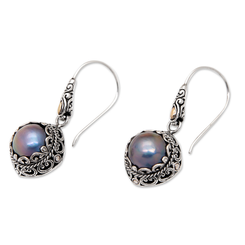 Backed by our 100% Happiness GuaranteeTwo exquisite cultured Mabe pearls in a lovely blue hue are encapsulated by intricate engraved sterling silver motifs in this pair of fabulous dangle earrings designed by Bali's Dewi Putera. Featuring subtle 18k gold-plated accents, the heavenly earrings are sure to catch the eye and fill any attire with sophistication.