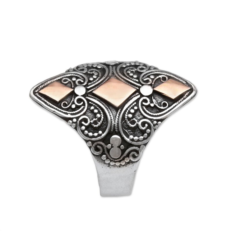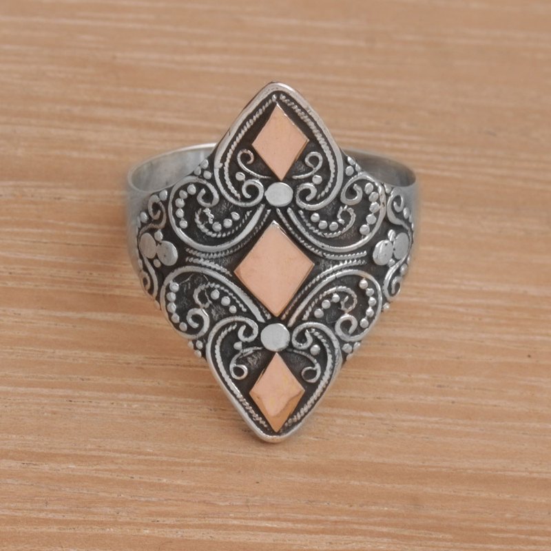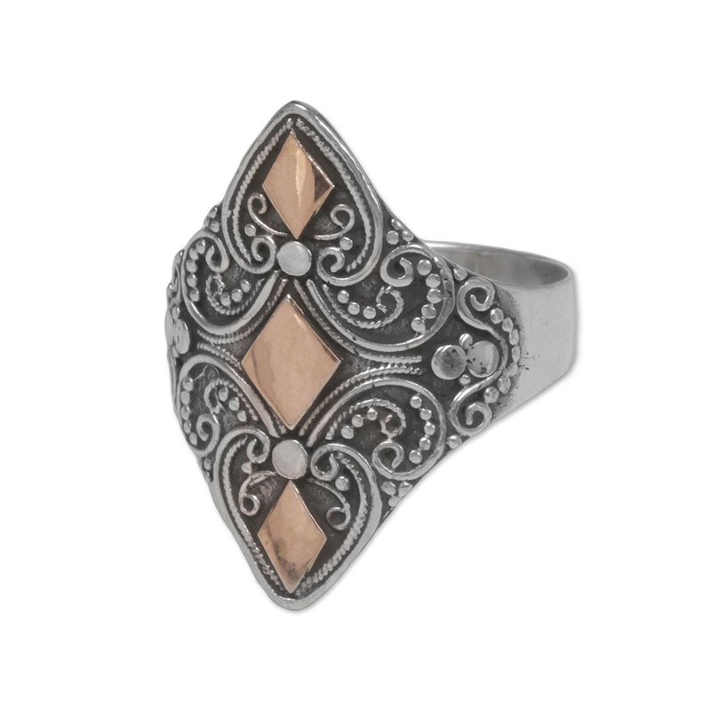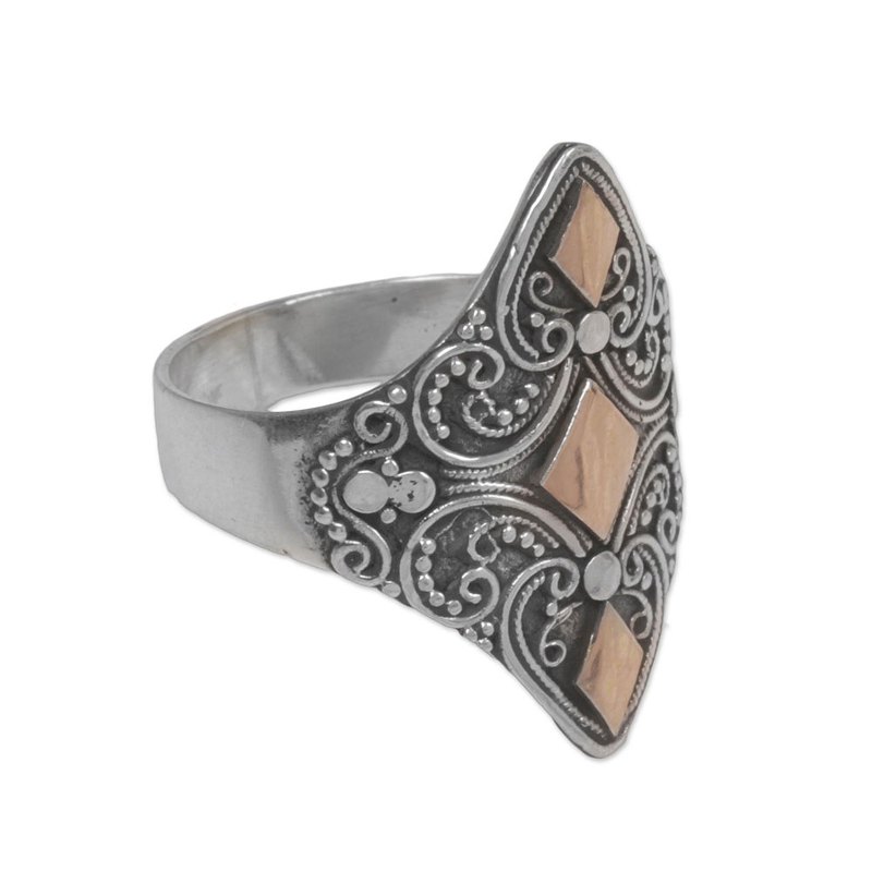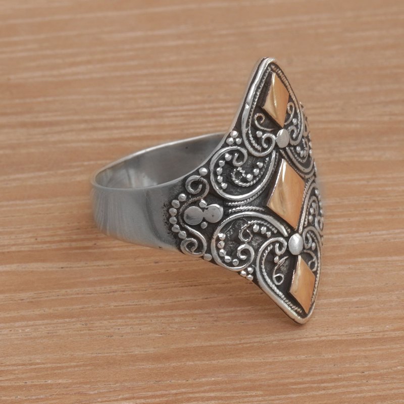 Presented by Komang Wijayana, this dreamy cocktail ring features three diamond-shaped accents of 18k gold at the front. The elegant ring is crafted by hand of sterling silver by local Indonesian artisans, featuring intricate circle, dot, and spiral motifs that surround the gold accents.