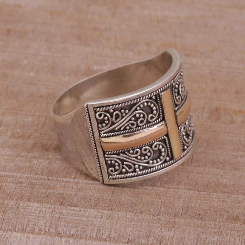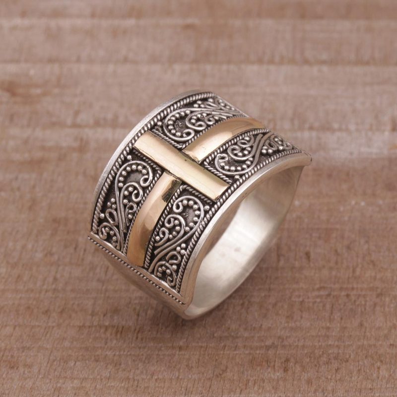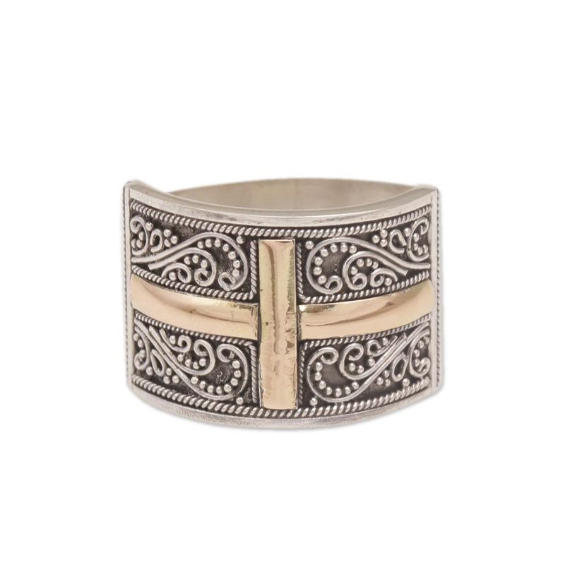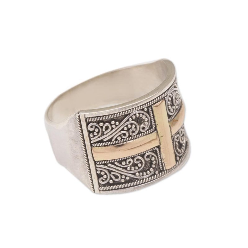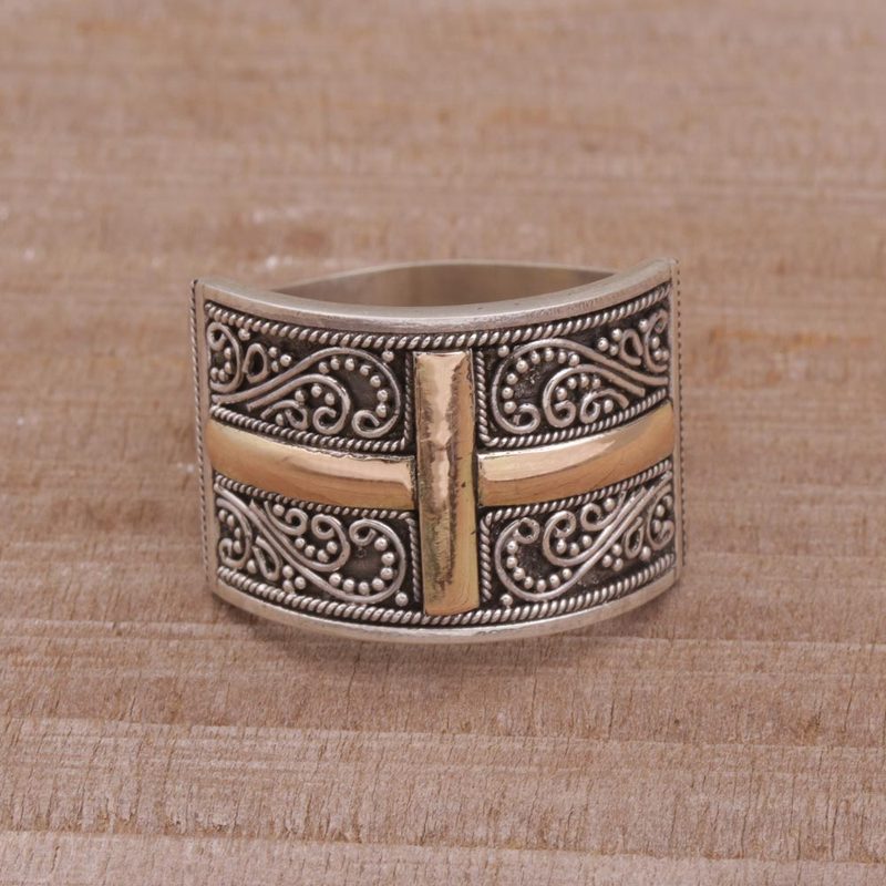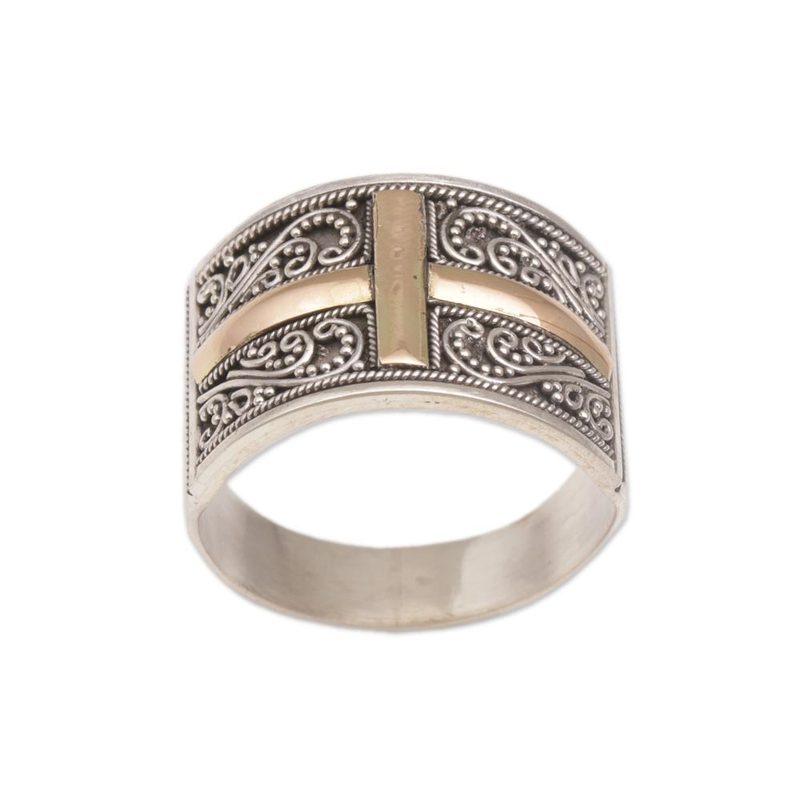 This unisex band ring from Komang Wijayana combines sterling silver with yellow gold in a beautiful design. Artisans craft the sterling ring by hand using traditional Balinese bun (wire) and jawan (silver granule) motifs. Illuminating the center is a shining cross in 18k gold plate.