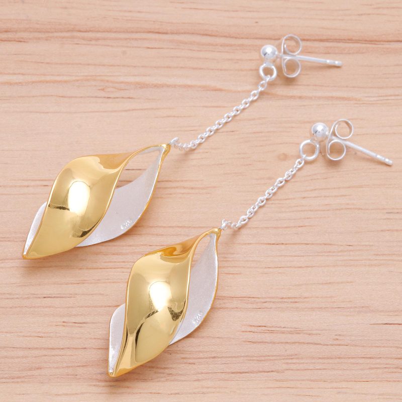 Backed by our 100% Happiness GuaranteeDesigned to twist, shimmer, and spin, Lalana's exquisite dangle earrings shift from silver to gold and back again. The Thai artisan uses 18k gold-plated sterling silver to hand craft the twisted motif, leaving the inside a matte silver. Suspended from a sterling silver chain, the earrings shine as they rotate.