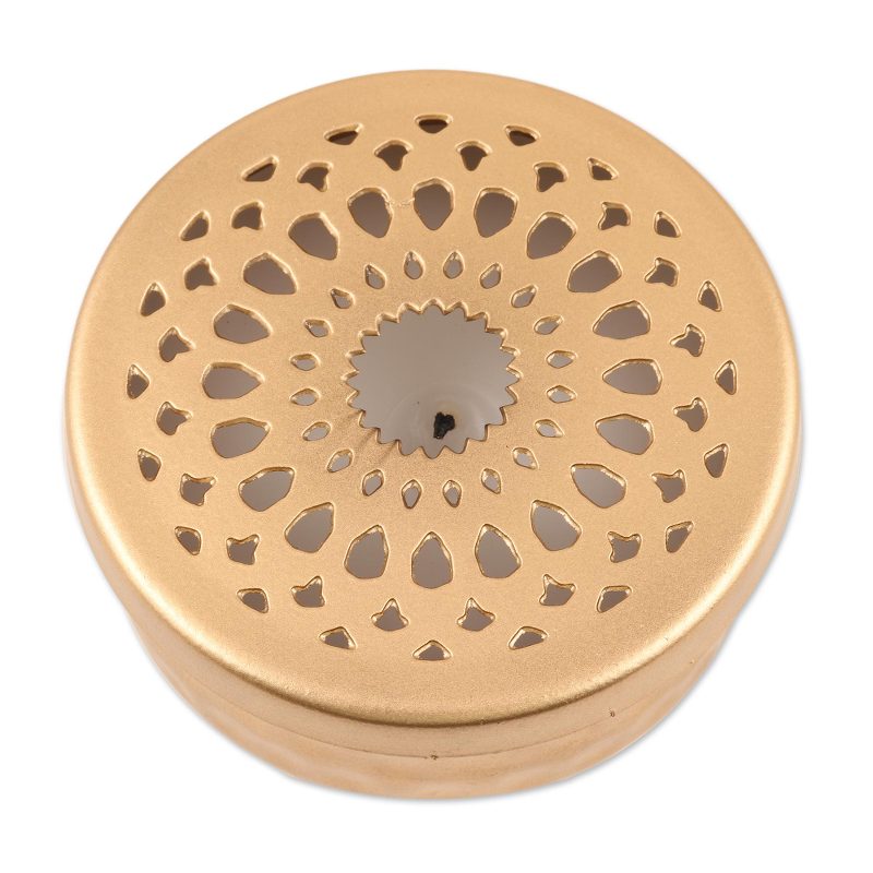 Backed by our 100% Happiness GuaranteeFlickering candlelight dances in this lovely design from Arti Sharma. Crafted with hammered textures, the petite candleholder features a lid with symmetrical jali cutout motifs. The steel container receives a powdery finish in golden tones. The inside paraffin candle comes ready to use. The pretty holder can be used after as a tealight holder.