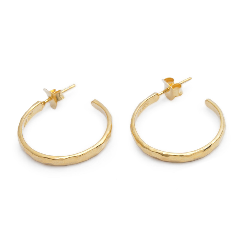 Crafted by hand, these earrings reveal a radiant glow. Hammered textures enhance the slender half-hoops by Nyoman Ariawan. The Balinese artisan works in sterling silver bathed in 18k gold.