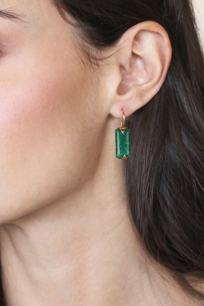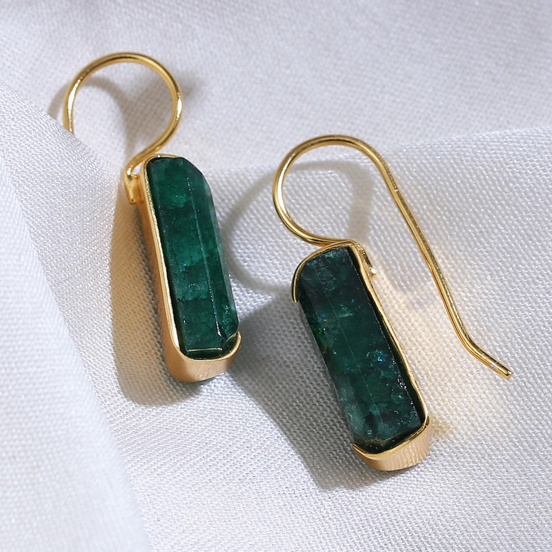 Indian artisan Neetu Barathi channels modern minimalism in this sophisticated design showcasing rectangular, emerald-hued beryl stones. Framed by shimmering 18k gold-plated sterling silver, the vibrant gems are the undeniable stars, exuding glamor that instantly elevates any look. Add a pop of color to any ensemble with these fabulous drop earrings that prove minimalism can make the ultimate maximalist impact.