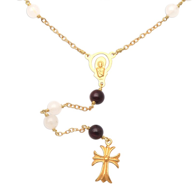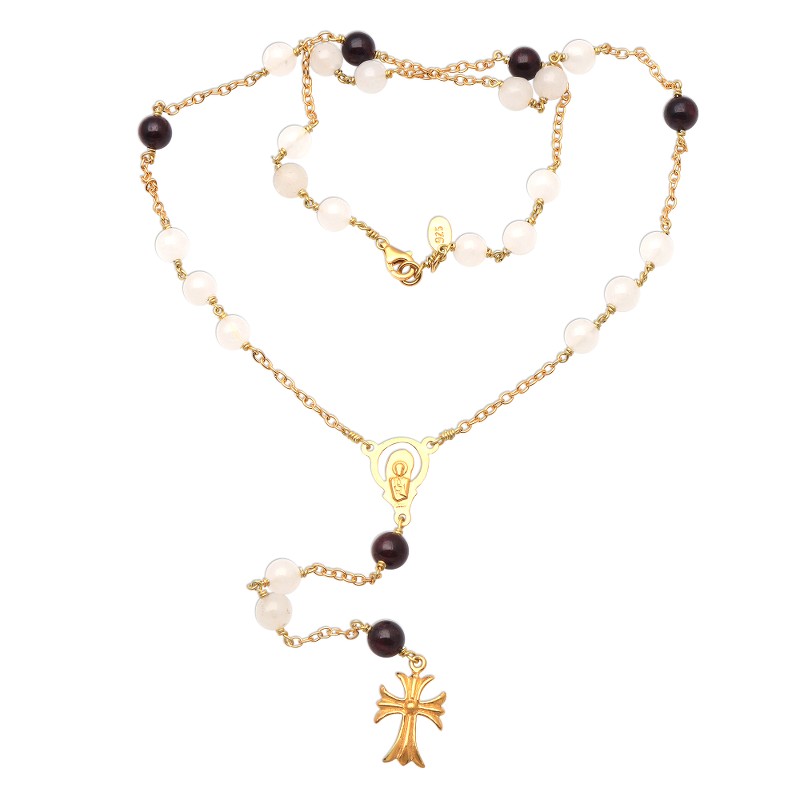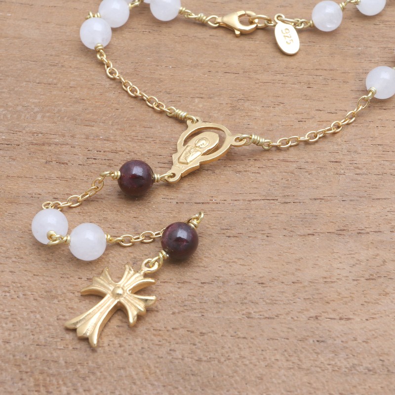 Backed by our 100% Happiness GuaranteeLinked by sterling silver chain bathed in 22k gold, delightful moonstone and garnet gems circle the neck. Balinese artisan Ketut Sulastri creates the rosary, which culminates in a golden cross and gemstone beads that swing from a pendant depicting the Virgin Mary.