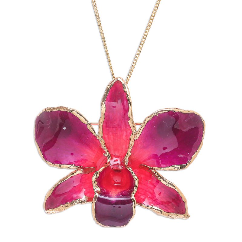 Crafted from genuine orchid petals, this necklace from by Thai artisan Danai catches the eye with its unique flower shape and rich color. The radiant red petals are coated with a glossy resin, then accented with 22k gold-plated edges. The pendant may be removed from the 22k gold-plated brass chain and worn as a brooch. Please note the size and the shape of the orchid petal may vary from season to season.