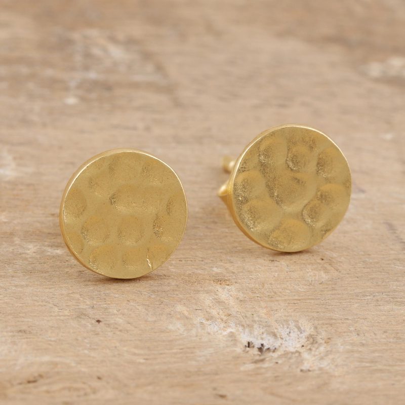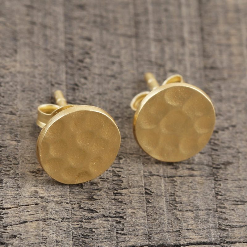 Backed by our 100% Happiness GuaranteeIndian artisan Vivek Nathany designs a deceptively simple pair of button earrings that glow with a golden sheen. Crafted from 22k gold-plated sterling silver, the round earrings are treated with a hammered finish that adds an intriguing textured element.