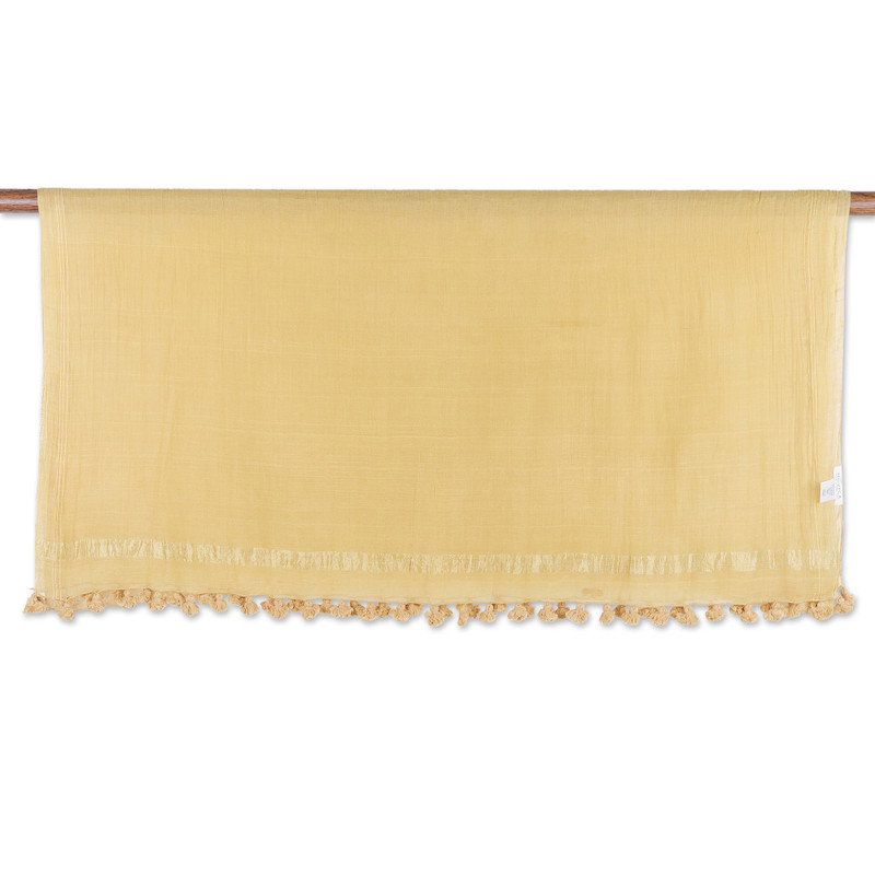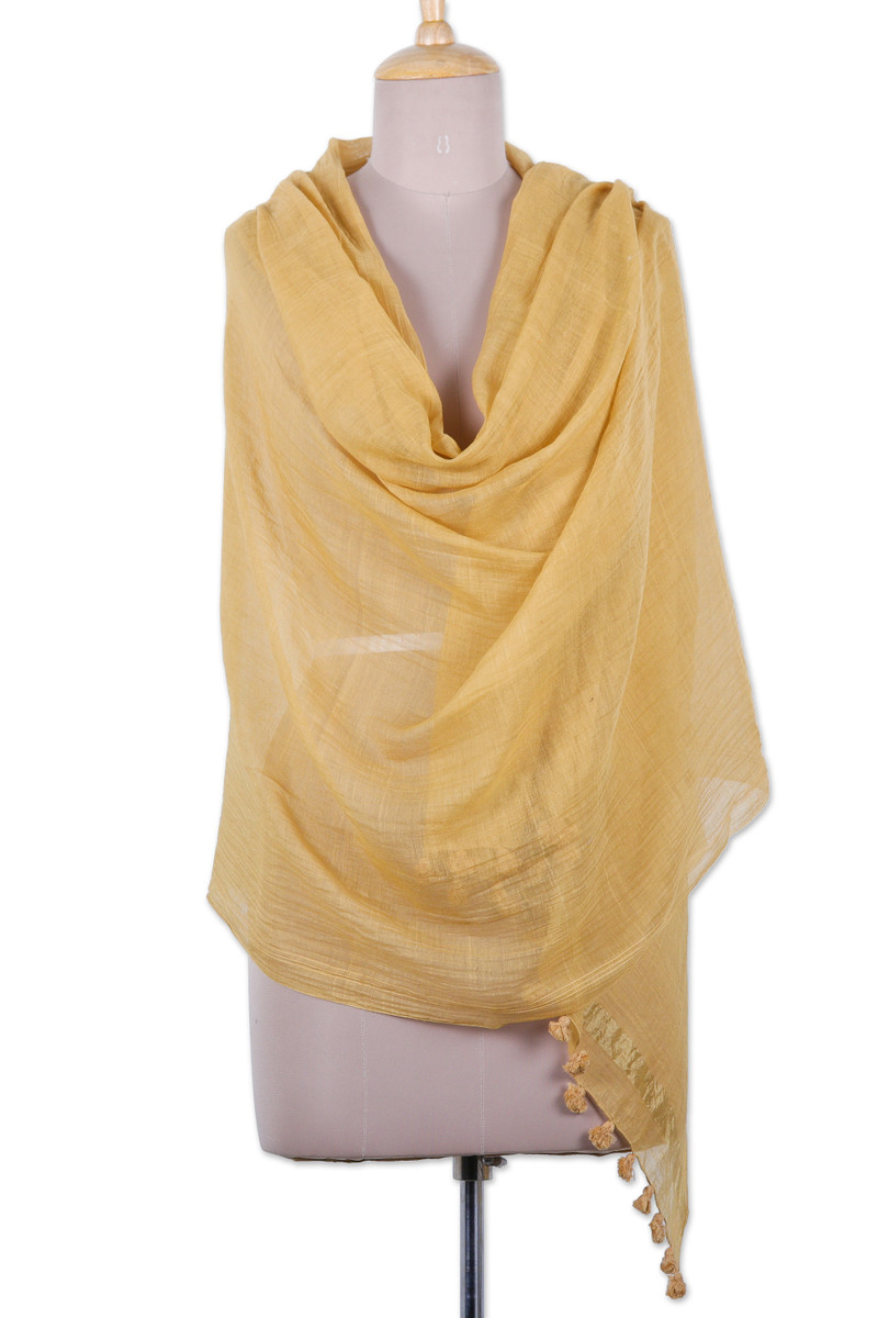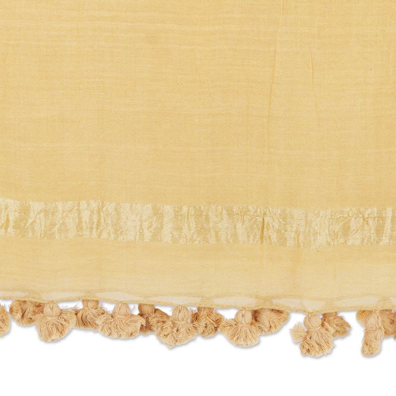 Arnab Roy and his team of talented Indian artisans create a trendy collection inspired by elegance and luxury. Following the advanced techniques that make Indian textiles unique and glorious, the team uses a loom to create this gorgeous shawl, whose cotton and silk blend yarns allow for a beautiful drape and comfortable sensation. The garment comes in a goldenrod hue and is adorned with tassels that evoke the region's glamour.