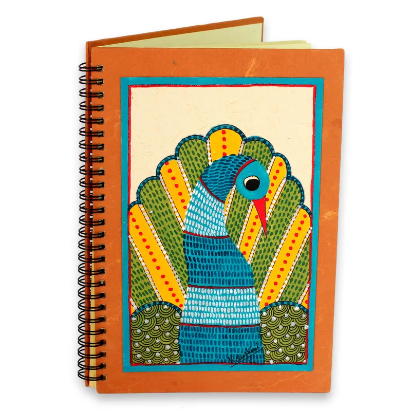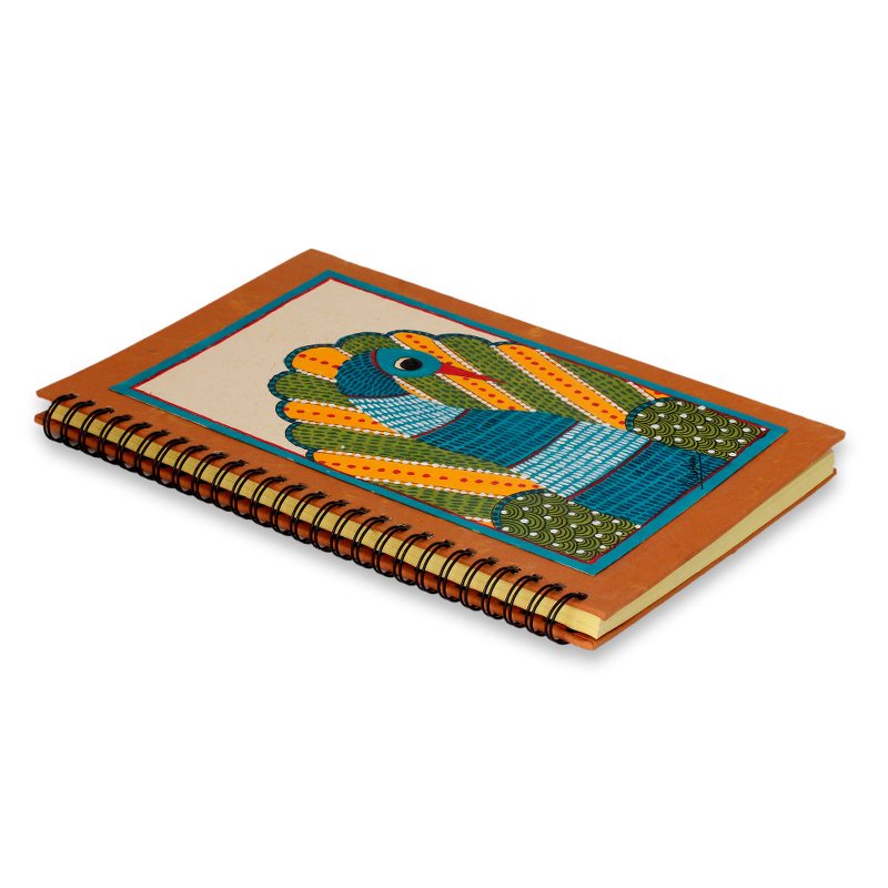 A colorful peacock struts his stuff on the cover of this journal from Vidushini in India. The artisan paints the front cover by hand in the traditional Gond folk art style, which was once used to adorn the walls and floors of a home. The journal is made of handmade paper and features 40 unlined pages and a spiral binding.