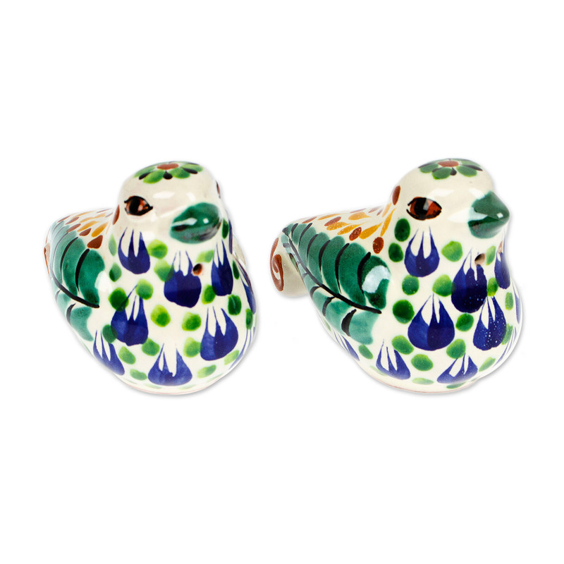 Delivery EstimateCrafted from ceramic and painted by hand in tones of green and blue, two doves bring the traditional charm of majolica handicrafts to any kitchen or dining room. Mexican artisan Gorky Gonzalez creates these salt and pepper shakers. One shaker features a single hole under the beak, while the other features two. Each shaker is marked with the artisan's initials, as well as the letters "AT" for Alfarería Tradicional (Traditional Pottery).