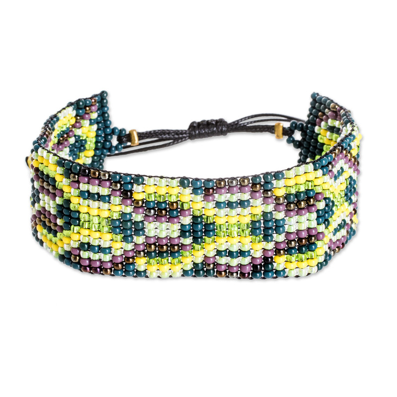 Green and yellow hues unite to create this geometric-patterned wristband bracelet, made to symbolize good luck. Guatemala's Hands Of Atitlan Association crafts this sublime accessory in a masterful display of artistry, all using glass beads for a radiant look. The piece is also equipped with a sliding knot that allows for adjustable length.