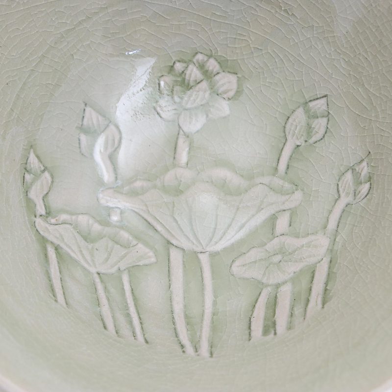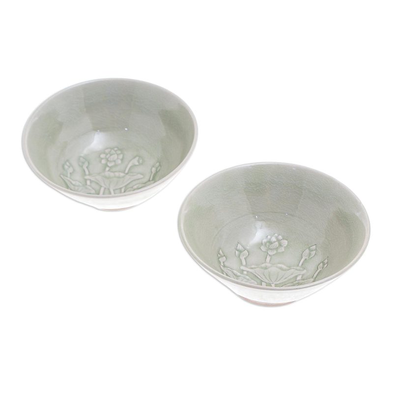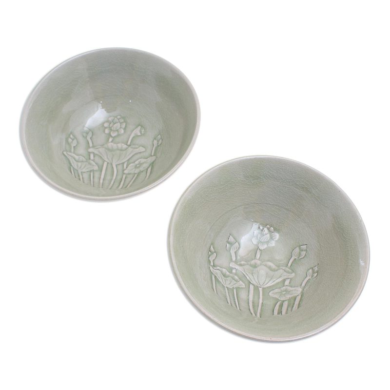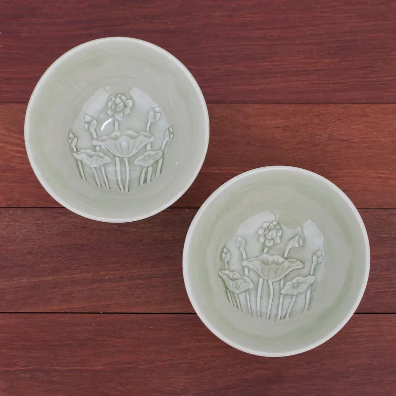 Enjoy dinner for two in style with this pretty pair of bowls designed by Thai artisan Duangkamol. Hand crafted from green celadon ceramic, the pair feature an elegant lotus flower motif on the inside and a subtly crackled finish.