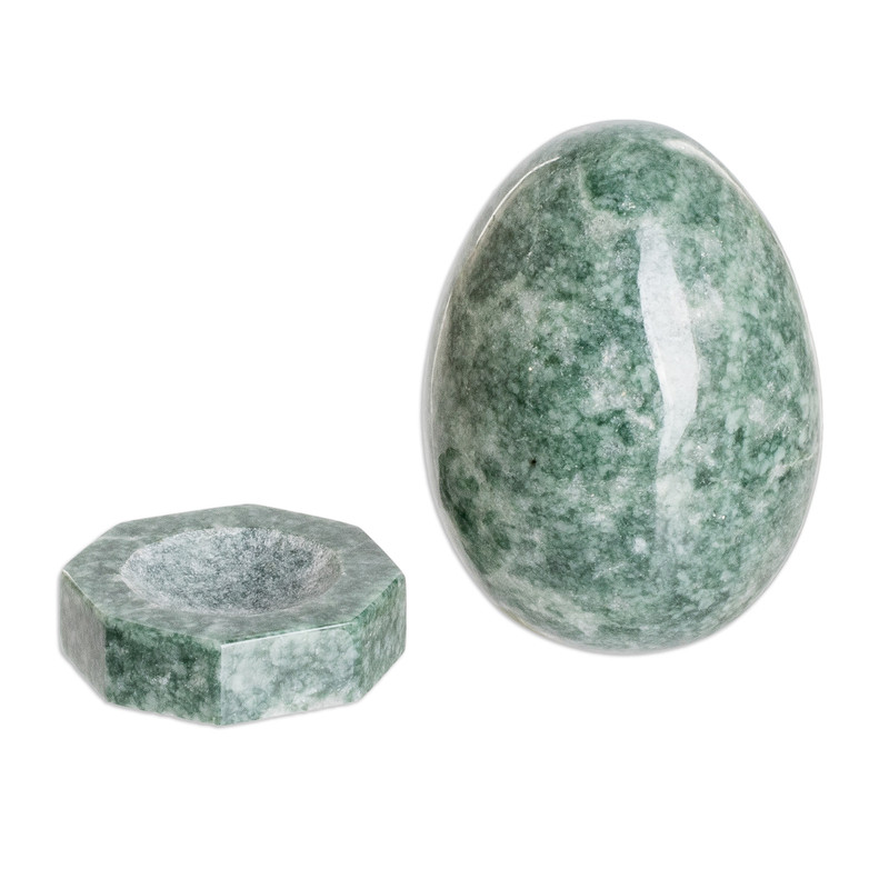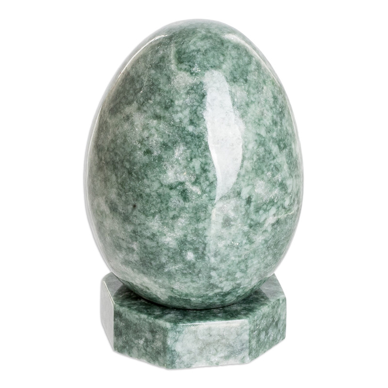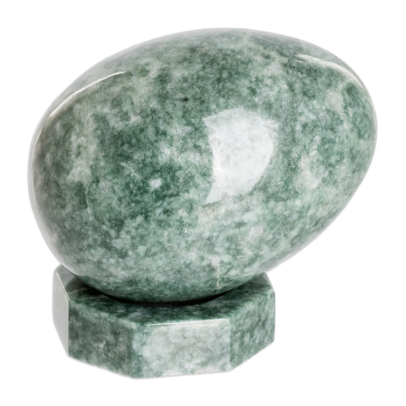 Jade is believed to bring calmness on an emotional and spiritual level, providing protection and purification, thus promoting balance in the healing of body and mind. Guatemalan artisan Zandra Lorena Sajbin chooses this precious stone to create a breathtaking egg sculpture to radiate beauty and good vibes in your surroundings. This versatile decorative accent can be displayed either vertically or horizontally on its accompanying stand, and also be used for massages and skincare routines as it offers a refreshing and revitalizing sensation due to jade's natural cooling properties.