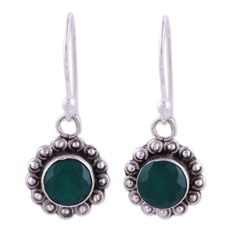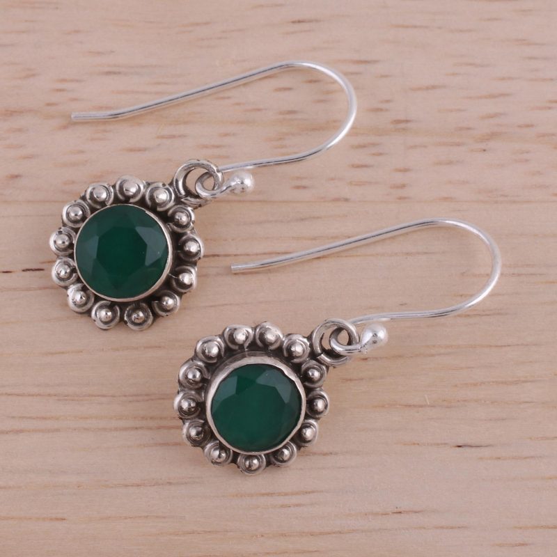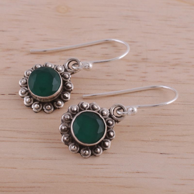 The allure of a flower in bloom is captured in the form of these dangle earrings from Alok Jain. Sterling silver dots make up the petals, blooming around faceted green onyx gems that total 3.5 carats. An oxidized finish on the petals give the earrings a vintage charm.