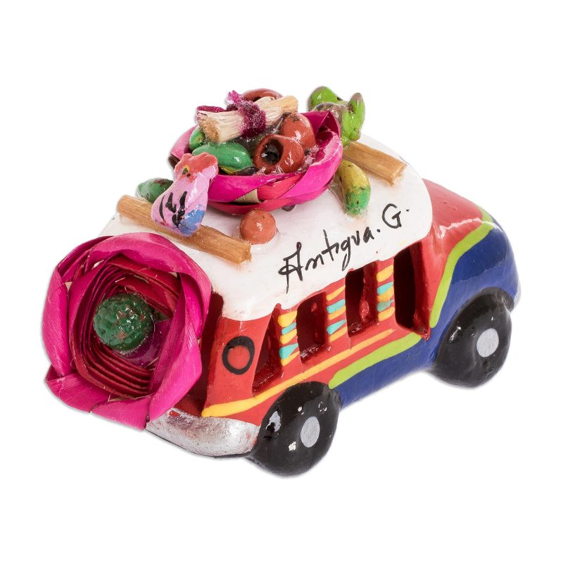 Backed by our 100% Happiness GuaranteeA colorful school bus adapted to inter-city service is loaded with a bright palm leaf basket on the roof. It carries a variety of ceramic and pinewood fruits and vegetables to and from rural market towns. Sometimes known as chicken buses, these old fashioned vehicles Inspire Guatemalan ceramicist Vitelio Orozco's diminutive three-inch bus in ceramic, hand-painted in bright colors.