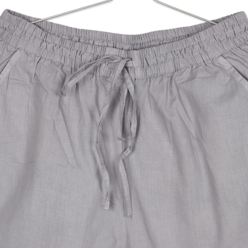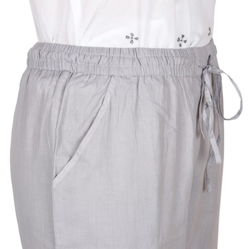 The versatile light grey color of these 100% cotton cropped pants by Indian designer Shalabh makes them a warm-weather wardrobe staple. The pants feature an elasticized drawstring waist and two side pockets, and traditional tone-on-tone chikankari embroidery in a floral and paisley design adds subtle detail to the hemline of each leg.