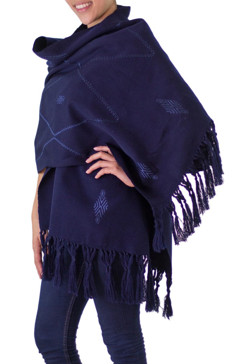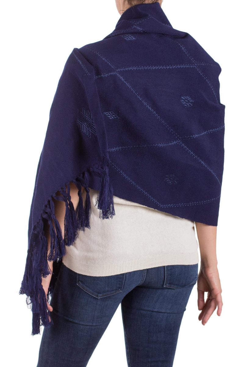 Delivery EstimateWorking on the traditional handloom, women from the Nu'Kem Association of Textile Artisans create this lovely shawl. They add shining diamonds in lustrous cotton to the blue wool blend.