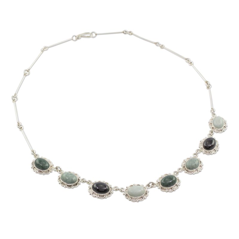 Framed in sterling petals, jade is beautiful in light green, dappled forest green, dark green and black. Zandra Lorena Sajbin sets the sleek oval gems in a beautiful and feminine necklace.
