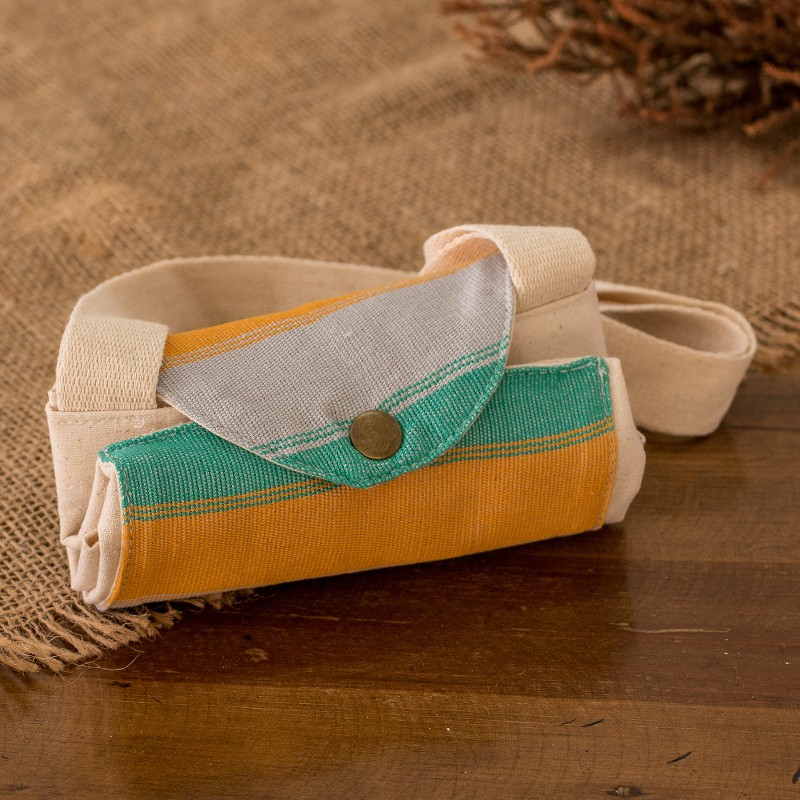 Fashionable and functional, this spacious cotton tote bag adds flair to your look while keeping you prepared for any shopping spree, excursion or travel day. Handcrafted by Fernando and Ana Cecilia in Guatemala, it features a pocket on the front woven by hand and adorned with vibrant grey, green and yellow stripes. The pocket's bronze button closure keeps your belongings secure and helps maintain the bag neatly folded for storage.