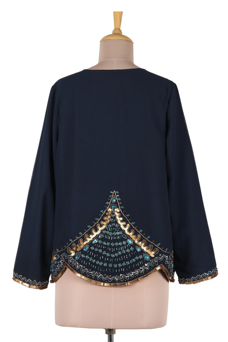 Shimmering sequins and bright glass beads glitter against the Pacific blue fabric of Vijay Singh's exquisite jacket. The long-sleeved jacket is hand-embellished by Indian artisans, who create sparkling patterns for an especially glamorous look.