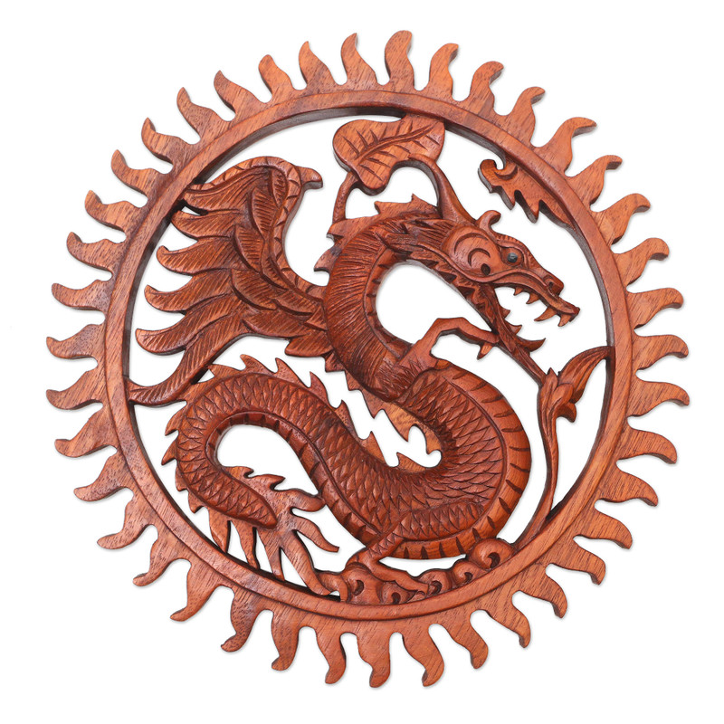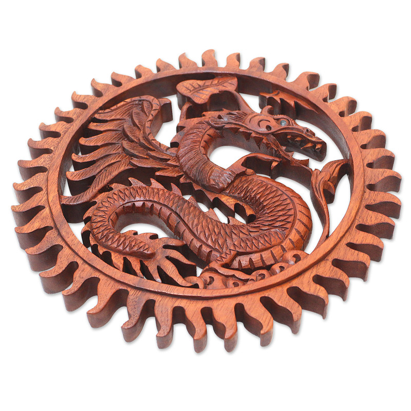 A splendid dragon stands nobly within a circle of fire in this gorgeous wall relief panel. Balinese artisan Seji hand carves the stunningly detailed design from local suar wood. This wall panel would make an impressive addition to home or office decor.