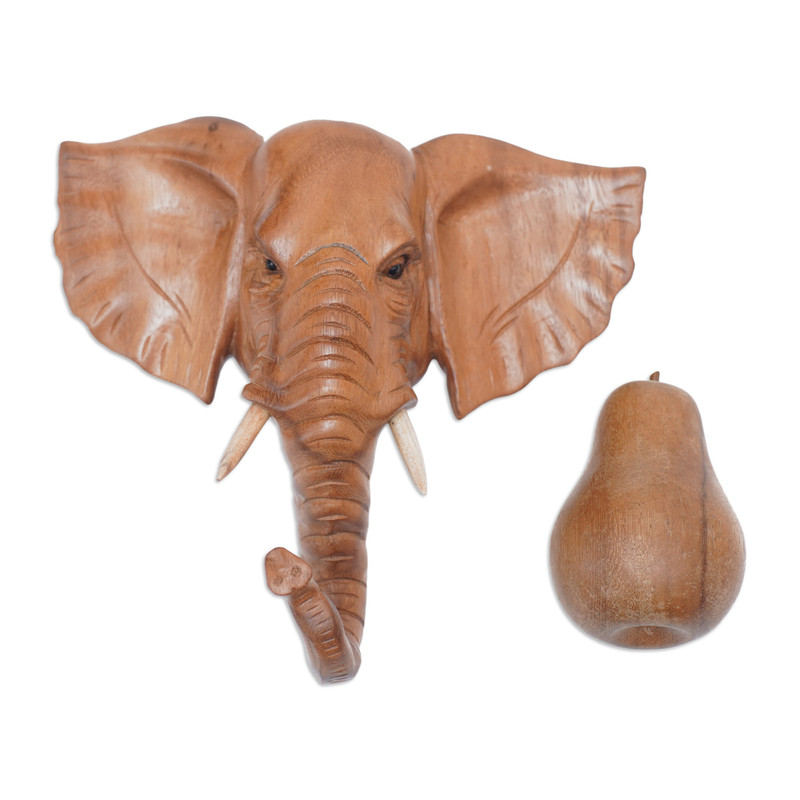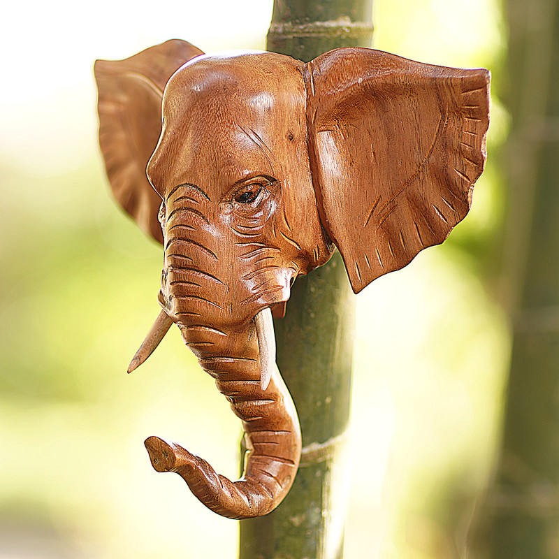 Masterfully carving suar wood, Made Mulyani depicts a young elephant. With ears extended, canny eyes and a questing trunk, the intelligent animal comes to life as a mask for wall display.
