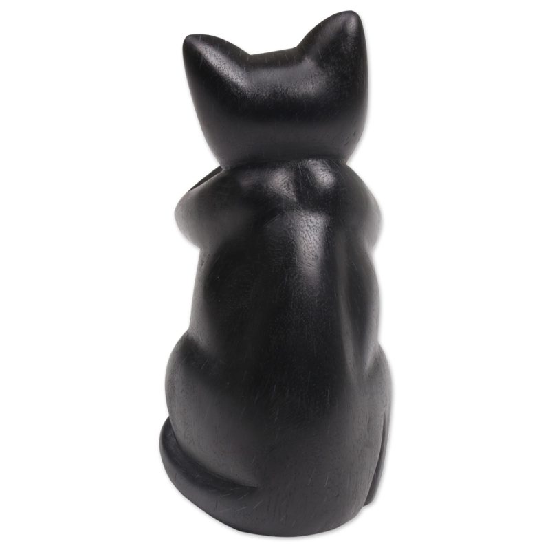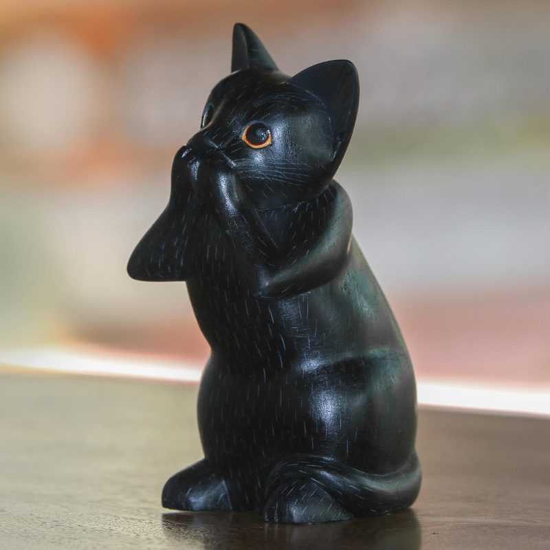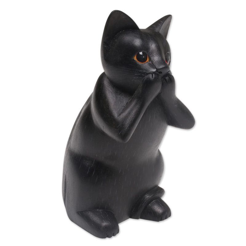 Hand-carved of Balinese suar wood, this cat holds its paws to its mouth, embodying the maxim "speak no evil." Nengah Sudarsana designs the sculpture, giving it a solid black finish.